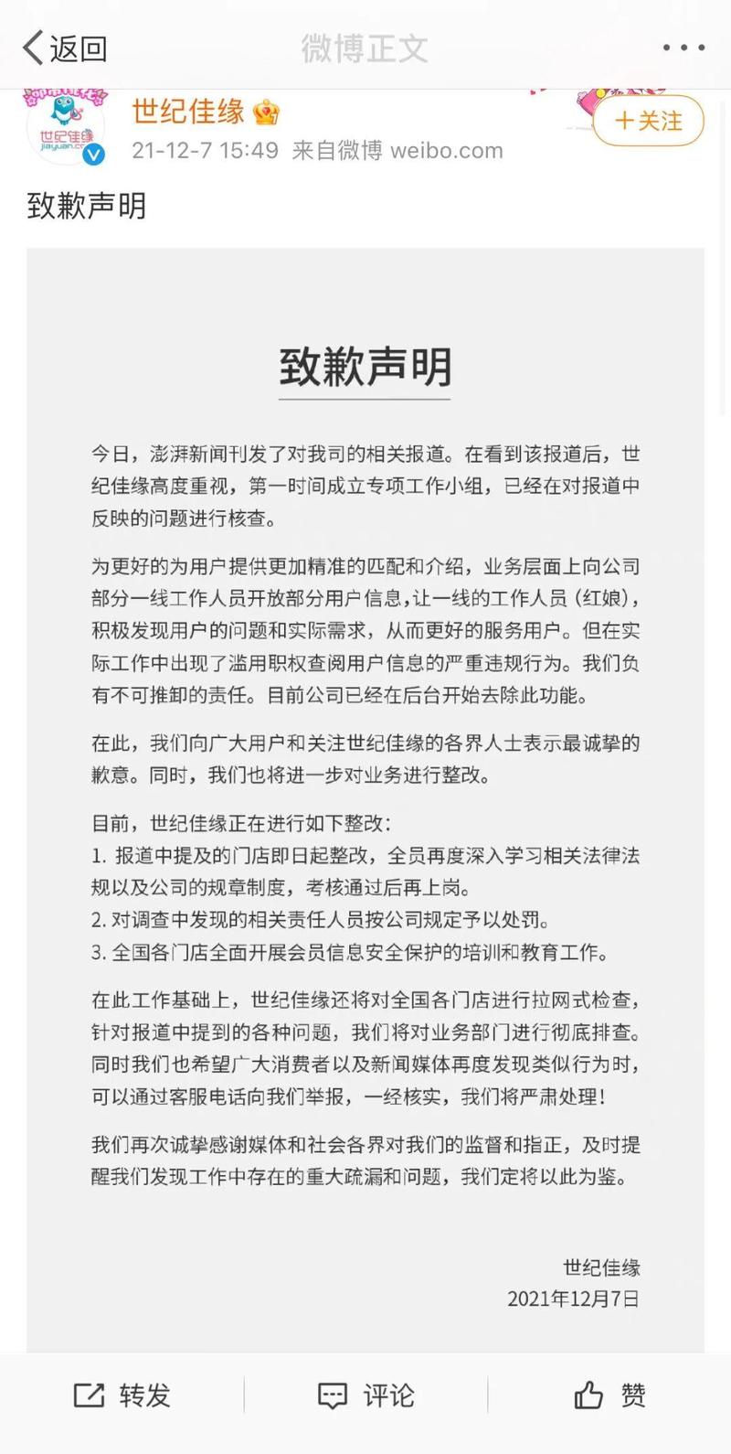 世纪佳缘官方微博发布致歉说明