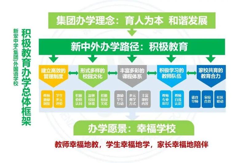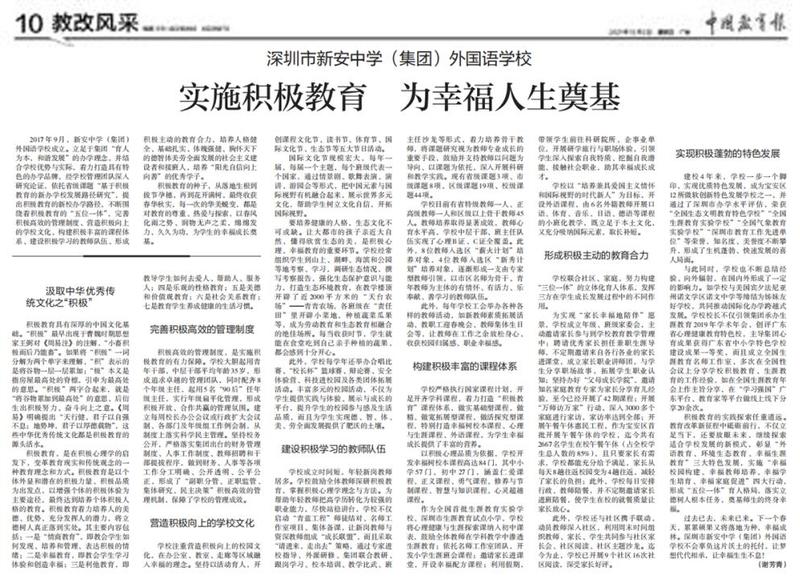 新安中学(集团)外国语学校学校坚持践行“积极教育”,彰显外语国际教育、生态环境教育、幸福生涯教育三大办学特色,形成了“高效管理、积极文化、丰富课程、和谐团队、家校协同”五位一体办学总体布局,走出了一条独特之路。