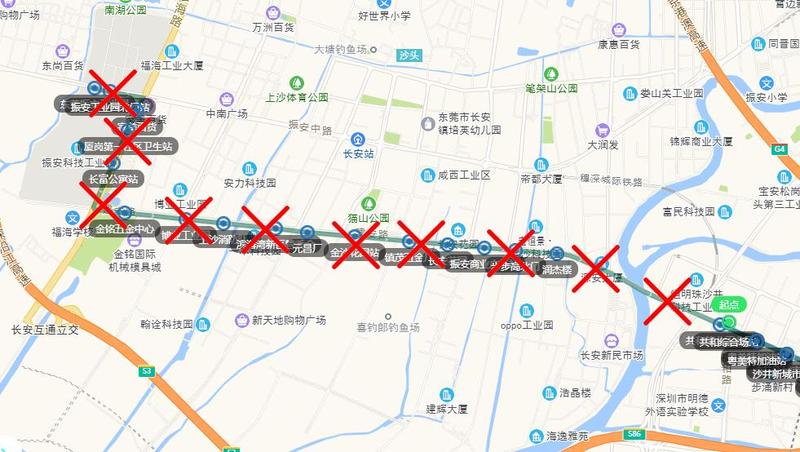 临时取消“东莞振安工业园”至“润杰楼”之间的所有公交停靠站。