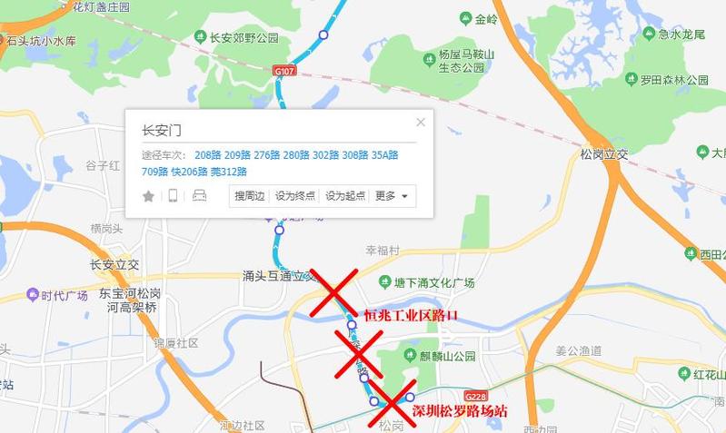 临时取消“深圳松罗路场站”至“恒兆工业区路口”之间的所有公交停靠站。