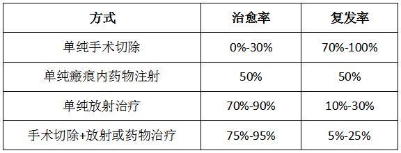 为中大型瘢痕疙瘩的一线治疗方法,因为手术配合药物或浅层放射可以有效控制瘢痕的复发,并且降低药物、放射等其他疗法的副反应发生率。