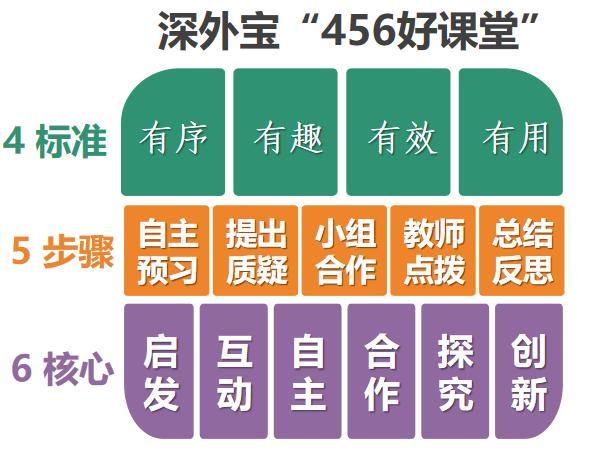 打造“456”教学范式,大胆改革,落实“有序、有趣、有效、有用”的课堂文化四有价值目标,坚持“自主预习、提出质疑、小组合作、教师点拨、总结反思”课堂教学五步骤,凸显“启发、互动、自主、合作、探究、创新”的课堂教学理念六个核心。