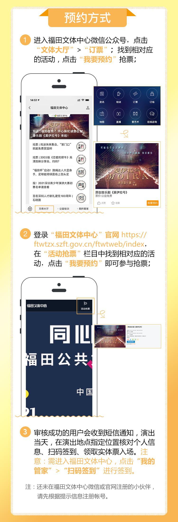 ①网上预约成功后,至少提前半个小时,在音乐主题馆二楼剧场门口,扫码签到,领票入场,一人一票,对号入座,儿童凭票入场。疫情防控不间断,别忘了做好防护,请正确佩戴口罩,提前出示健康码,主动配合工作人员体温测量及其他疫情防控安排。未有健康码或14天内到过有中、高风险区,体温超过37.3摄氏度,未佩戴口罩者不能进场。场内禁止饮食。