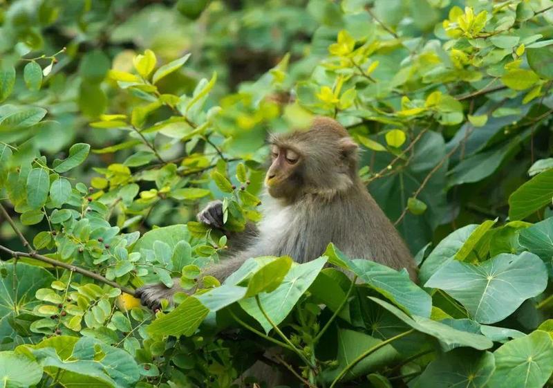 冬日里的补给。一些挂在枝头的野果是哺乳动物的食粮,内伶仃岛上的猕猴正在摘食小果叶下珠的果实。潘国林/摄