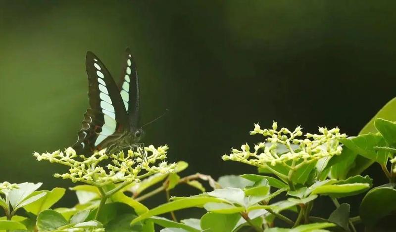 盛开的广东蛇葡萄吸引着青凤蝶采蜜。大部分传粉的昆虫在气温15度以上就会活跃飞行。南兆旭/摄
