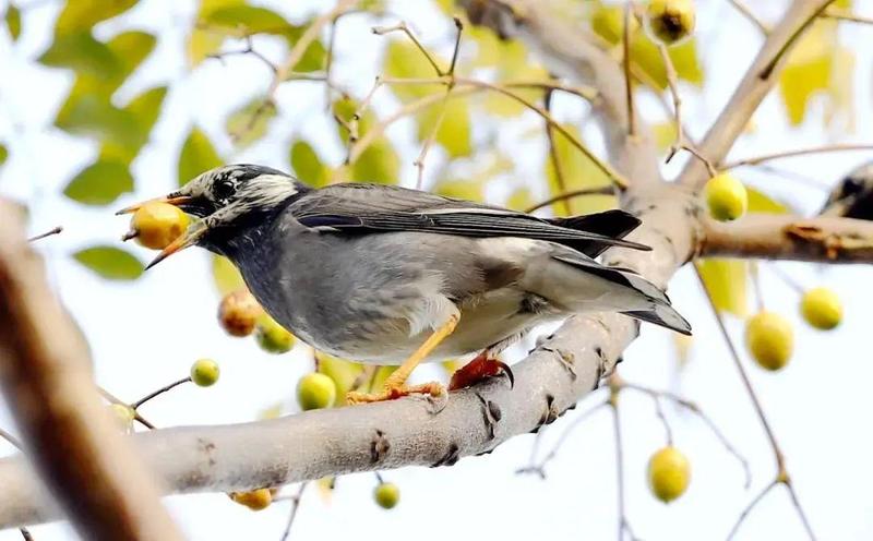 享受苦楝树果实的丝光椋鸟。秋日里一些植物成熟的果实是动物的美食。南兆旭/摄