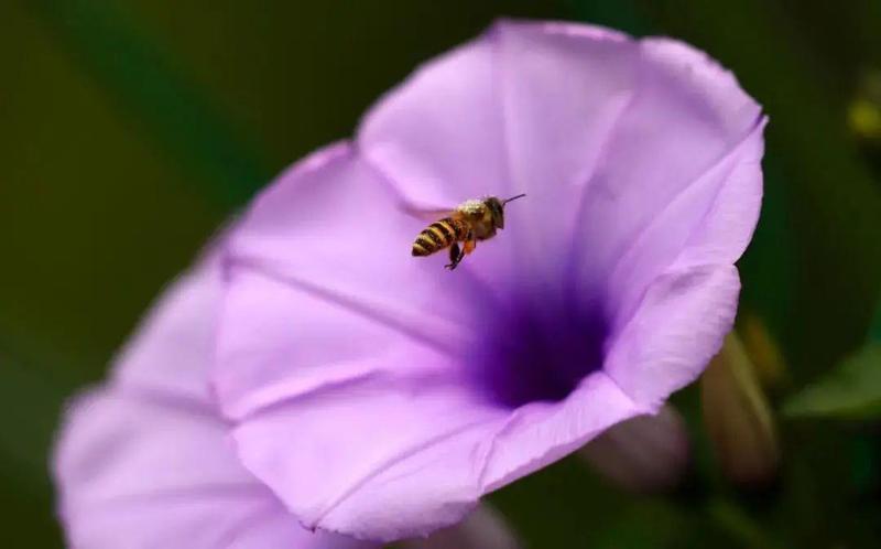 在五爪金龙花朵中采蜜的东方蜜蜂,夏季是深圳最多植物开花的季节。南兆旭/摄