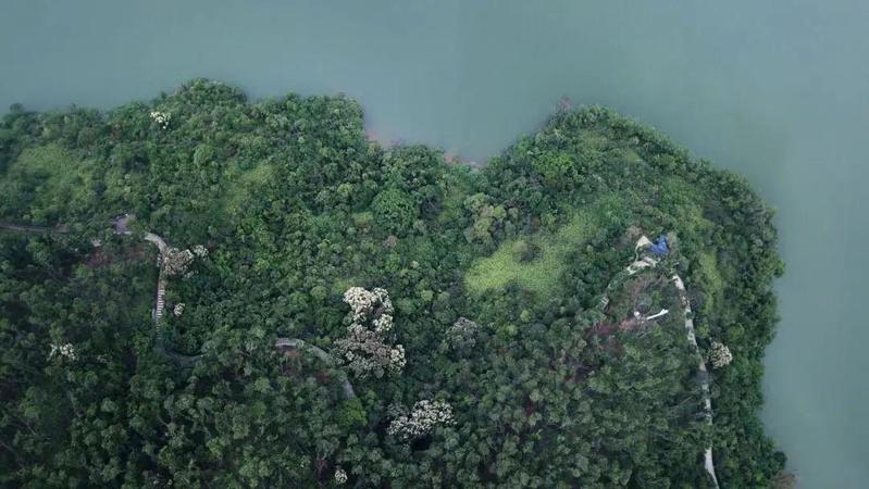 春日的色彩,深圳水库沿岸的绿道。丛林的嫩绿新叶中,黧蒴锥(lí shuò zhuī)开满一树的白花。南兆旭/摄