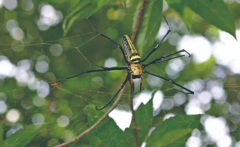 夏日里的相会。深圳体型最大的结网蜘蛛雌性斑络新妇(人面蜘蛛),左下角细小的褐红色蜘蛛是它的丈夫。南兆旭/摄