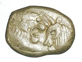 吕底亚金币,约1.5英寸×1.2英寸大小。金币上刻有克罗伊斯时期的狮子与公牛头图案。