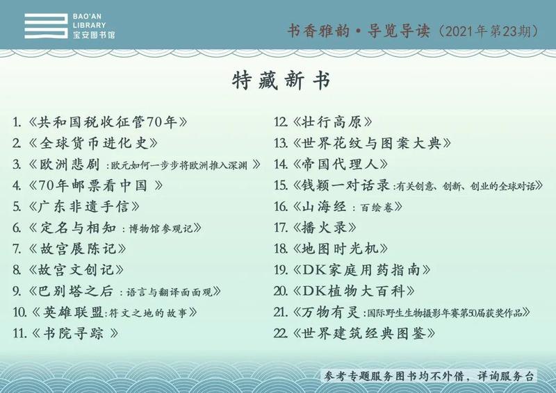 本期主题为“特藏新书”,推荐书目有《共和国税收征管70年》《全球货币进化史》《70年油画看中国》《广东非遗手信》《故宫文创记》等23册。欢迎读者前往阅览!