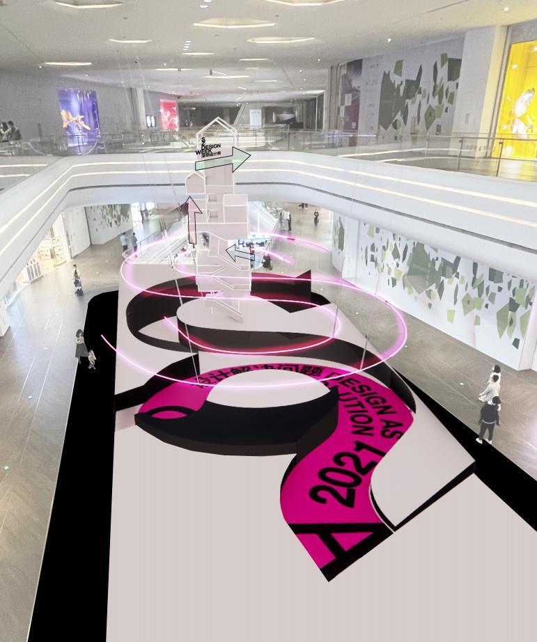 2021深圳设计周主题阐释展寓意“探索的田野与瞭望之塔”,空间化展现设计过程中思想蜿蜒至明朗的过程与对深圳设计未来的展望。故事的展示体验横纵展开,水平方向以设计周主题logo S与问号交织为观展小径,2D平面延展为三维空间,各板块内容自然流淌其中。垂直望楼指引设计周各个展厅的方向,也意为设计之路建立灯塔,拨开云雾,解决问题。