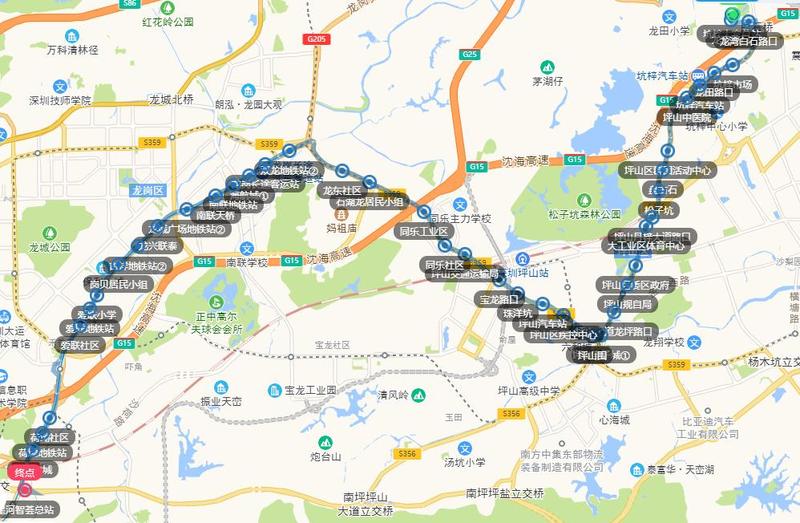 坑梓大窝总站、龙窝路口、龙湾白石路口、坑梓市场、龙田路口、坑梓汽车站、坪山中医院、坪山区群团活动中心、盘古石、松子坑、坪山丹梓大道路口、大工业区体育中心、坪山区委区政府、坪山规自局、坪山大道龙坪路口、坪山电子城①、坪山围、坪山区疾控中心、坪山汽车站、珠洋坑、宝龙路口、坪山交通运输局、同乐社区、同乐工业区、石湖龙居民小组、龙东社区、双龙地铁站②、龙岗长途客运站、海航城①、南联地铁站、南联天桥、龙城广场地铁站②、龙兴联泰、吉祥地铁站②、岗贝居民小组、爱联小学、爱联地铁站、爱联社区、荷坳社区、荷坳地铁站、水晶之城、星河智荟总站