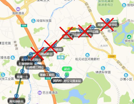 双方向取消“松元公园、松元厦地铁站①、岗头村”等3对公交停靠站,往民乐地铁站北公交场站方向取消“观澜地铁站、马坜居委会”等2个单边公交停靠站,增加“河西村、新岭工业区、荷叶榕市场①”等3个单边公交停靠站,往横坑河东村公交首末站方向,取消“观澜地铁站①”1个单边公交停靠站,增加“新澜公司、南粤药业、观城社区工作站”等3个单边公交停靠站。