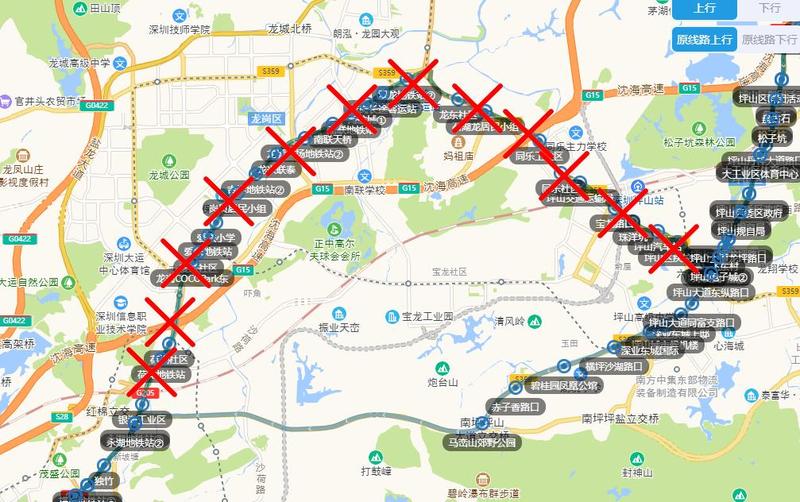 往坑梓基地总站方向增加“混凝土公司、京宜工业区、碧岭社区、金碧超群路口”等4个单边公交停靠站,取消“马峦山郊野公园”1个单边公交停靠站。