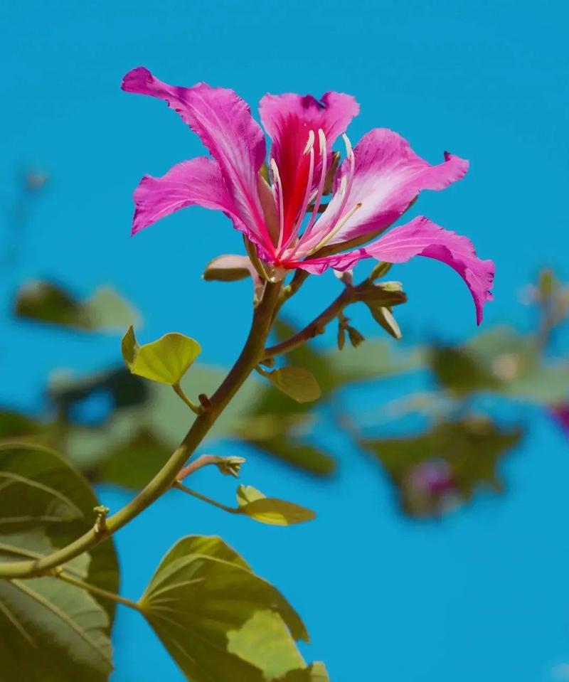 半落叶乔木。叶革质,顶端2裂。总状花序顶生或腋生,花冠紫红色。通常不结果。本种1965年被定为香港的市花,1997年7月1日香港回归祖国,该花的图案又被定为香港特别行政区区徽。