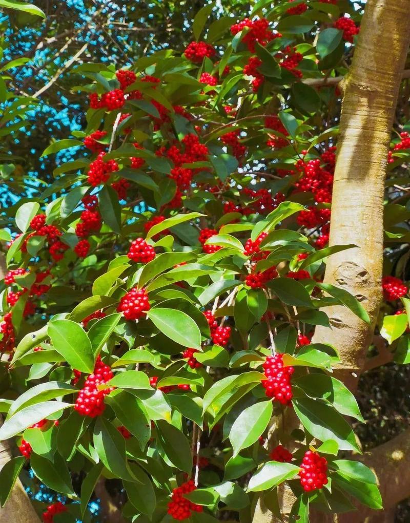 常绿灌木或乔木,树冠呈伞形,叶色终年浓绿亮泽,果期着果数量多,鲜红色的核果格外灿烂夺目,是优良的冬季观果植物。