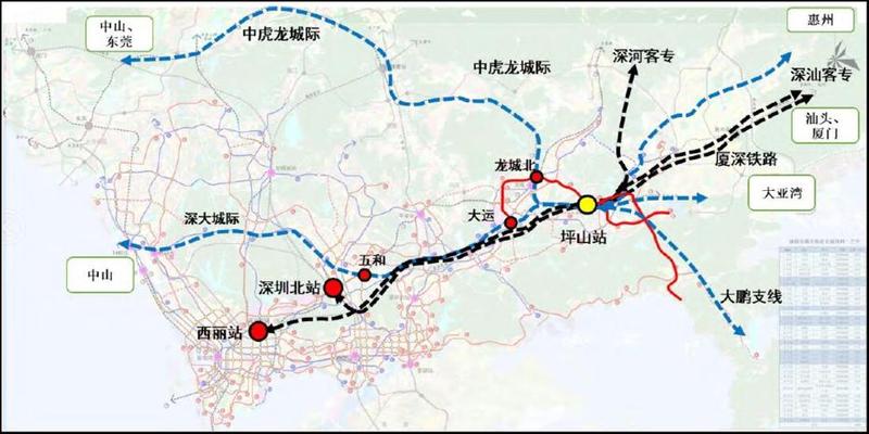 此外,坪山高铁站可直达长沙、上海、杭州、南京、武汉、厦门、福州等多个省外重点城市,近期,坪山站正在实施综合改造,深大城际、深惠城际大鹏支线、深汕铁路均已开工建设,加上即将建成的地铁16号线、云巴1号线一期,以及规划中的深河客专、轨道23号线等轨道线路,坪山站将打造为深圳轨道线路制式最齐全的综合交通枢纽,将汇集 3 条国家铁路、2条城际铁路、2 条城市轨道和 1 条小运量云巴8条轨道交通,还包括无人驾驶公交、常规公交、出租车、小汽车、慢行等多种交通接驳方式,将作为粤港澳大湾区向东辐射最重要的门户枢纽。