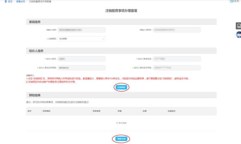 进入界面后,系统自动带出纳税人名称、纳税人识别号、经办人信息,核对无误后选择注销原因。注销申请信息填写完毕可点击“注销预检”按钮。