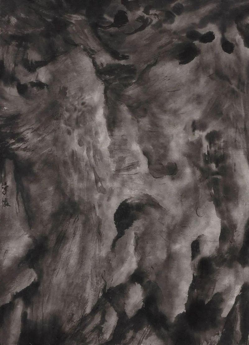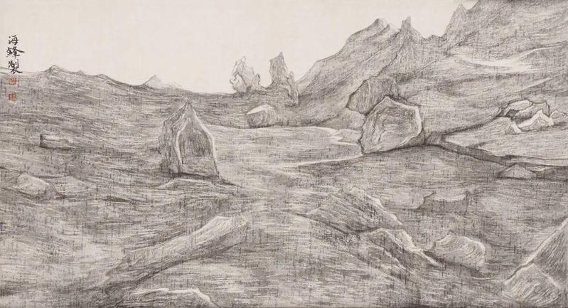“天地初开,鸿蒙初辟”是曾海波画作追求的“荒寒之境”。大自然原始混沌的状态让他欣喜,给予他创作的养分。笔墨、材料、技法的探索往往通过心手相应来实现。他认为这种探索是向内的,是一种心向往之的过程。