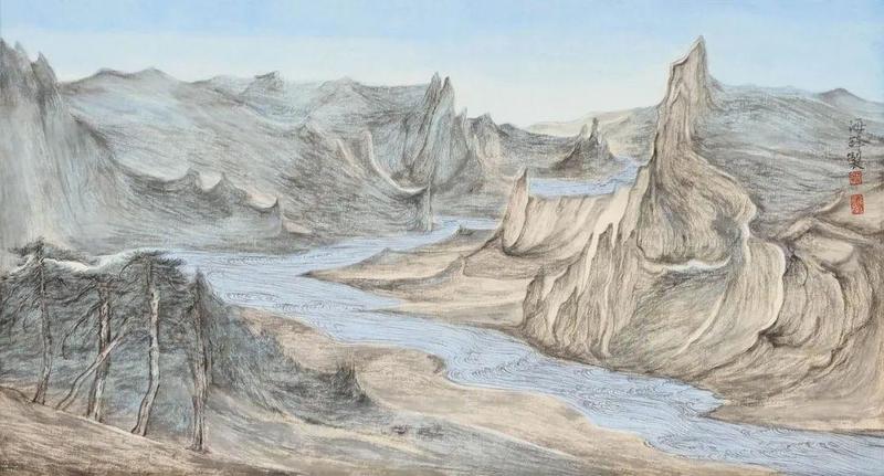 他主要围绕山水画的造境语言如何传递特定的丘壑,颜色和墨相互的转换来传递他造境的理念,包括以平远、深远为主的丘壑的延伸,来传递一种温婉幽淡的情绪,这种情绪从喧嚣的当代情境来看,尤其体现出冲和散淡,自在自足的状态,这种状态包含他对现实山水的情怀和眷恋。