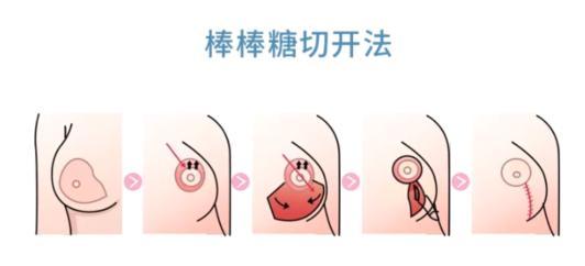 垂直切口缩乳术(俗称“棒棒糖”切开法):围绕乳晕的圆圈做一个切口,在乳晕下面加一个垂直的切口。