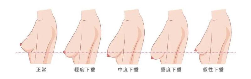 通常女性尤其是年轻女性的乳房乳头的水平应在乳房下方皱褶(即乳房下皱襞)之上,若低于该处即存在乳房下垂,下垂的严重程度与乳房下极和乳房下皱襞的关系有关。