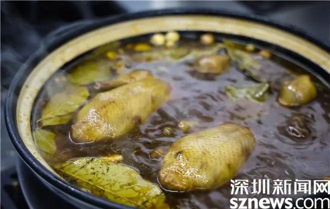 灶台前,何文生首先把处理干净后的乳鸽放进由灵芝、八角、桂皮、香叶、小茴等13种中药材熬制的卤水中,卤水锅由小火慢炖着,鸽身被浸泡在卤汁里,这个“泡澡”过程大概持续15分钟。随后,只见何文生将乳鸽捞出过清水后放置一旁晾干,晾干后又过脆皮水再晾干。何文生说,“这是变身‘鸽王’最为关键的一步,因为传统卤料可为其注入灵魂。”