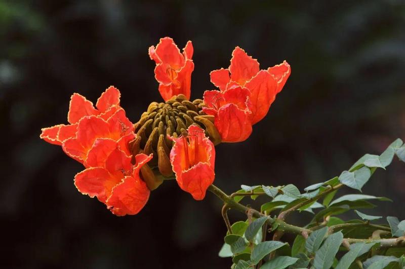 常绿乔木。花大,花萼佛焰苞状,花冠橙红色,开花时,花朵自外围向中心逐渐开放。