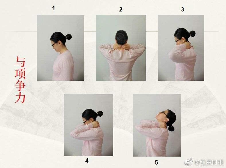 两手交叉,屈肘上举,用手掌抱颈项部,用力向前,同时头颈尽量用力向后伸,使两力相对抗,随着一呼一吸有节奏地进行锻炼。