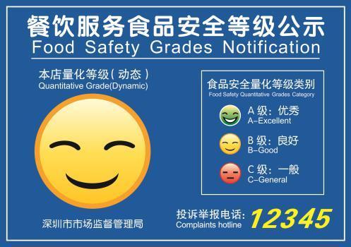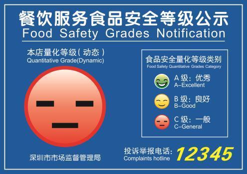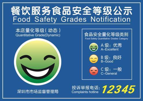 餐饮服务食品安全日常监督检查量化分级实行等级管理,具体分为三个级别,即A级(代表食品安全状况优秀)、B级(代表食品安全状况良好)、C级(代表食品安全状况一般),分别用“大笑”“微笑”“平脸”卡通形象表示。