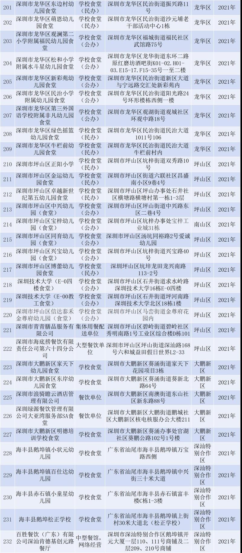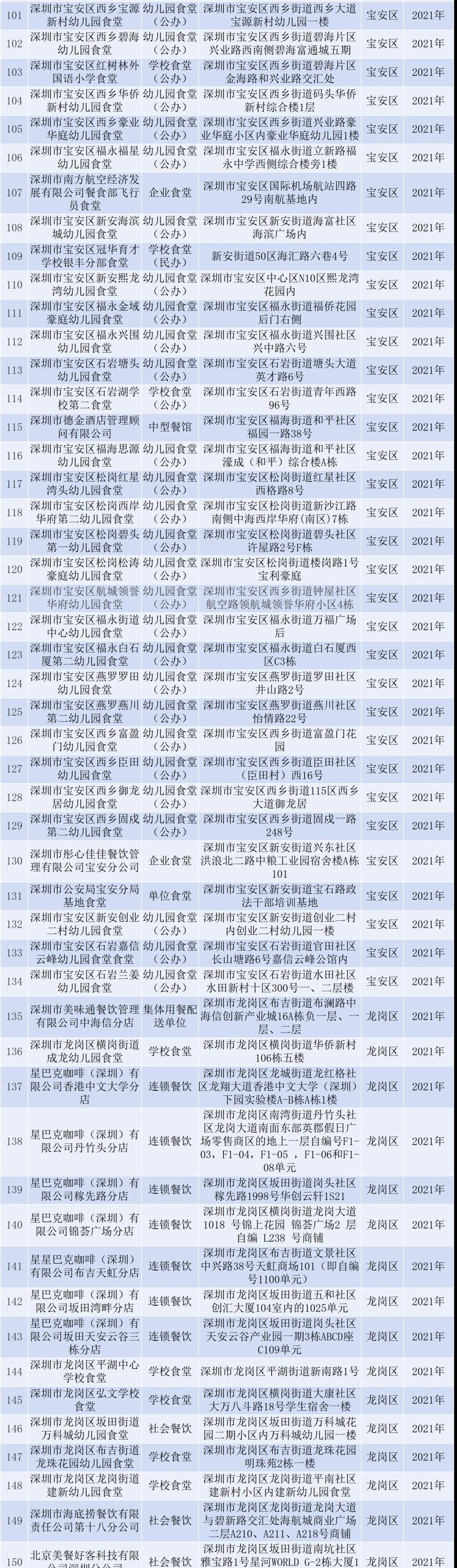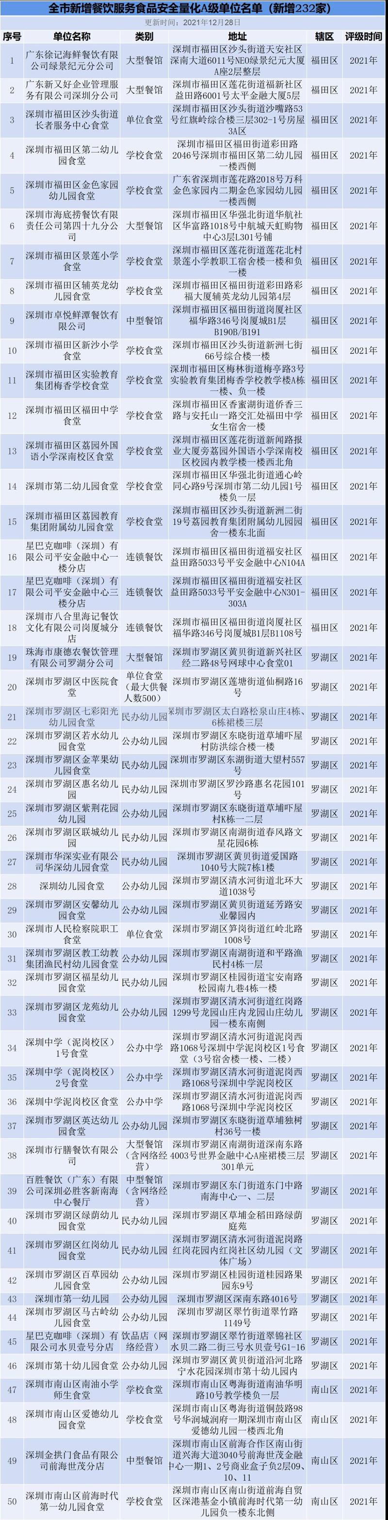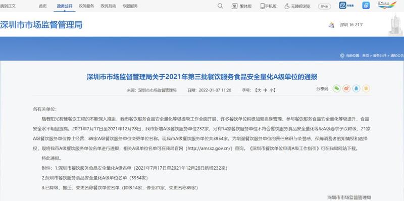 2021年7月17日至2021年12月28日,深圳市新增232家A级餐饮服务单位,14家餐饮服务单位不符合餐饮服务食品安全量化等级A级要求予以降级、21家A级餐饮服务单位停止经营、89家A级餐饮服务单位变更单位名称。现深圳市A级餐饮服务单位共3954家。