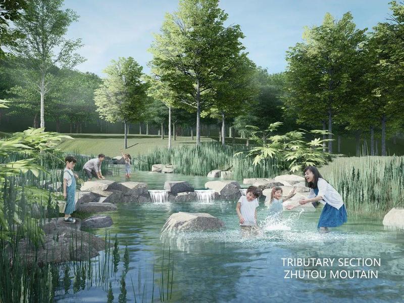 设计拟解决自然生态弹性赋值问题,形成一个完整的城市环境,围绕着本地生物打造的绿色廊道。慢行服务系统设计关注不同潮汐游客数量,新增水上活动与游线营造的整体体验系统,生态性碧道忙时为游客服务,闲时为本地人群服务,一直为自然服务。因地制宜构建大型下凹绿地,生态海绵空间,水下森林,红树林群落,特色森林课堂等。