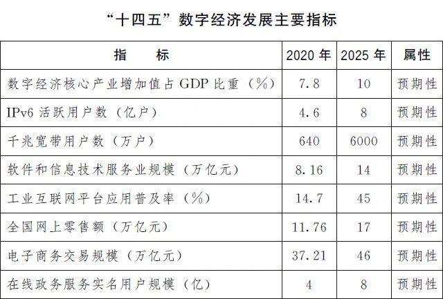 到2025年,数字经济迈向全面扩展期,数字经济核心产业增加值占GDP比重达到10%,数字化创新引领发展能力大幅提升,智能化水平明显增强,数字技术与实体经济融合取得显著成效,数字经济治理体系更加完善,我国数字经济竞争力和影响力稳步提升。