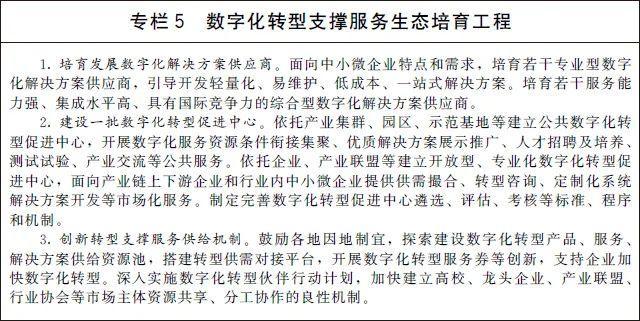 ——产业数字化转型迈上新台阶。农业数字化转型快速推进,制造业数字化、网络化、智能化更加深入,生产性服务业融合发展加速普及,生活性服务业多元化拓展显著加快,产业数字化转型的支撑服务体系基本完备,在数字化转型过程中推进绿色发展。