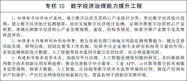 ——数字经济治理体系更加完善。协调统一的数字经济治理框架和规则体系基本建立,跨部门、跨地区的协同监管机制基本健全。政府数字化监管能力显著增强,行业和市场监管水平大幅提升。政府主导、多元参与、法治保障的数字经济治理格局基本形成,治理水平明显提升。与数字经济发展相适应的法律法规制度体系更加完善,数字经济安全体系进一步增强。