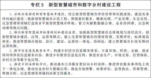 (三)推动数字城乡融合发展。统筹推动新型智慧城市和数字乡村建设,协同优化城乡公共服务。深化新型智慧城市建设,推动城市数据整合共享和业务协同,提升城市综合管理服务能力,完善城市信息模型平台和运行管理服务平台,因地制宜构建数字孪生城市。加快城市智能设施向乡村延伸覆盖,完善农村地区信息化服务供给,推进城乡要素双向自由流动,合理配置公共资源,形成以城带乡、共建共享的数字城乡融合发展格局。构建城乡常住人口动态统计发布机制,利用数字化手段助力提升城乡基本公共服务水平。