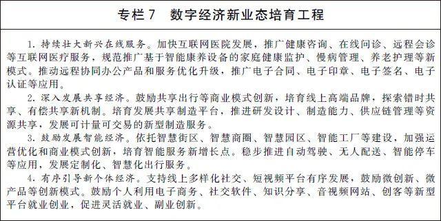 (三)加快培育新业态新模式。推动平台经济健康发展,引导支持平台企业加强数据、产品、内容等资源整合共享,扩大协同办公、互联网医疗等在线服务覆盖面。深化共享经济在生活服务领域的应用,拓展创新、生产、供应链等资源共享新空间。发展基于数字技术的智能经济,加快优化智能化产品和服务运营,培育智慧销售、无人配送、智能制造、反向定制等新增长点。完善多元价值传递和贡献分配体系,有序引导多样化社交、短视频、知识分享等新型就业创业平台发展。