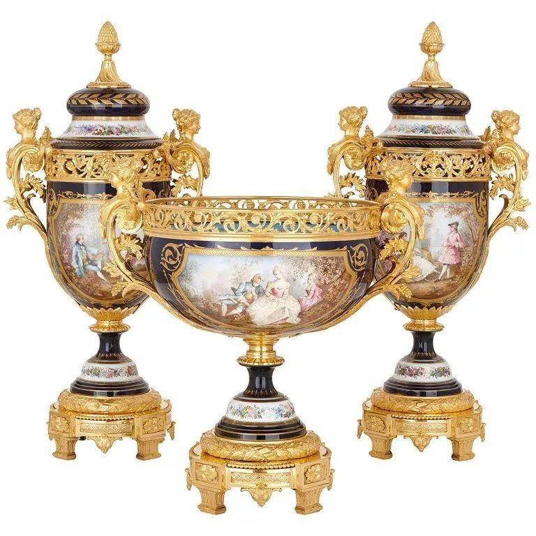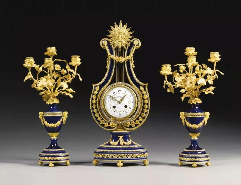 塞夫尔时钟与配饰套装是该公司在19世纪推出的摆饰。它通常由三件物品组成:一个时钟,配上一对瓮,或者是三件具有相似装饰主题的器皿。