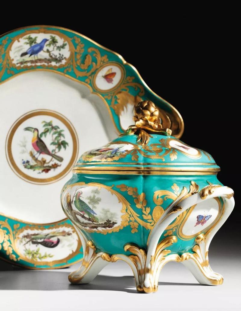 塞夫尔设计的成套餐瓷是收藏者一致追捧的一个类别。根据餐具的大小、风格的稀有性或原主的地位等特点,这些物品的价格范围可能会有很大的波动。小型的全套茶具或餐瓷,售价在10,000到15,000美元之间,而一些珍品可以卖得更高的价格。
