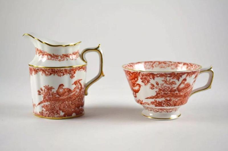朱砂孔雀系列的设计与蓝色天皇系列相似,以精致优雅的花卉图案为特色,其间点缀着各种禽类,长长的尾羽散落在白色的骨瓷上。