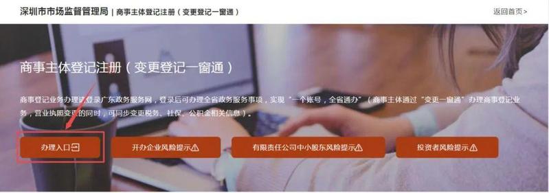 1、登录深圳市市场监督管理局官网,点击【商事主体登记注册】后,点击【办理入口】。