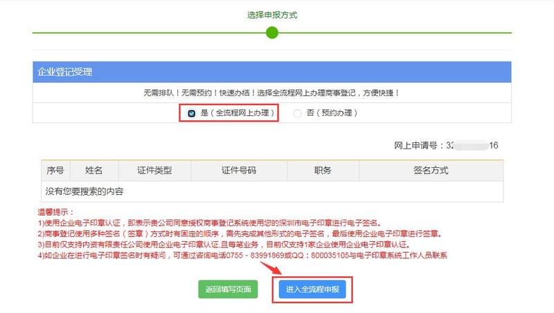 8、申报方式选择【是(全流程网上办理)】,点击【进入全流程申报】。