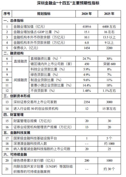 ——总体规模稳步提升。到“十四五”期末,深圳金融实力、发展质量达到国际先进水平,综合竞争力稳居全球金融中心前列。到2025年,深圳金融业增加值6400亿元左右,占地方生产总值比重16%左右;本外币存贷款分别达到13.5万亿元、9万亿元以上;保险市场保费收入达到2200亿元。银行、证券、保险等行业总资产、营业收入、利润等经营指标全国居前,排名位于“全球金融中心指数”(GFCI)前列。