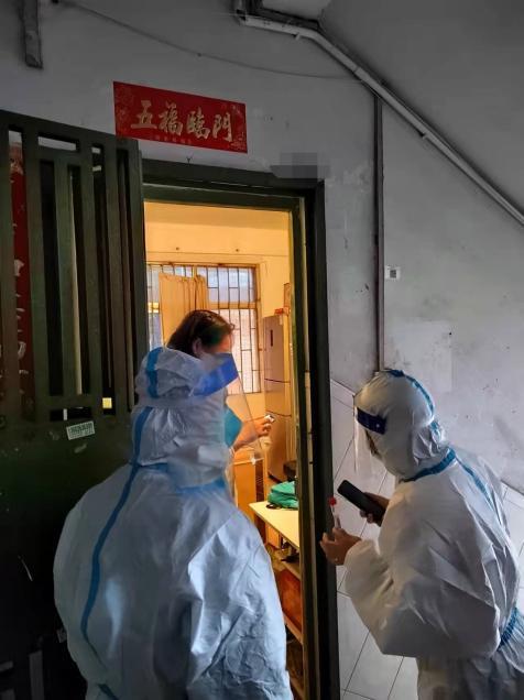 ↑黄志梅开门迎接核酸检测的医护人员与社区工作人员