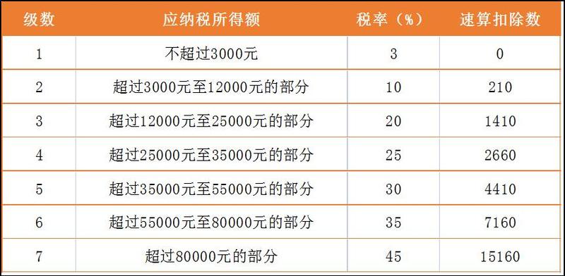 (2)年终奖:240000÷12(月数)=20000,适用按月度税率表(表1),则税额为:240000×20%(表1-级别3-税率)-1410(表1-级别3-速算扣除数)=46590元