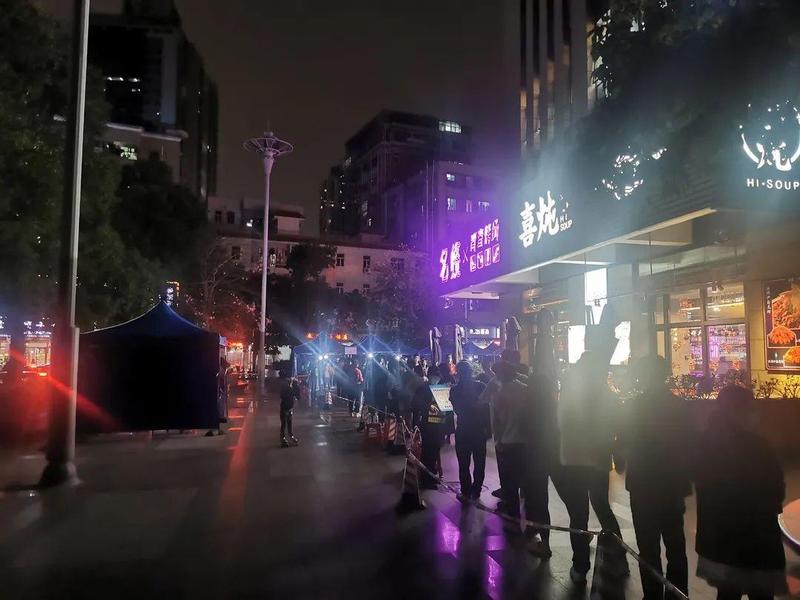 新洲村牌坊街嘉州富苑广场检测点是沙头街道众多核酸检测点之一,隔离带正好设在“名烧X青春烤场”门前。因为距离太近,川流不息的检测人潮把烧烤店遮挡得几乎找不到出口,即使是熟客,看到广场上成百上千的人,自然也担心人群聚集的传播风险,纷纷绕道走开,生意不可避免受到较大影响。