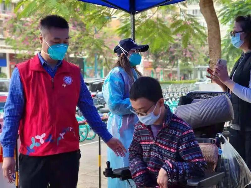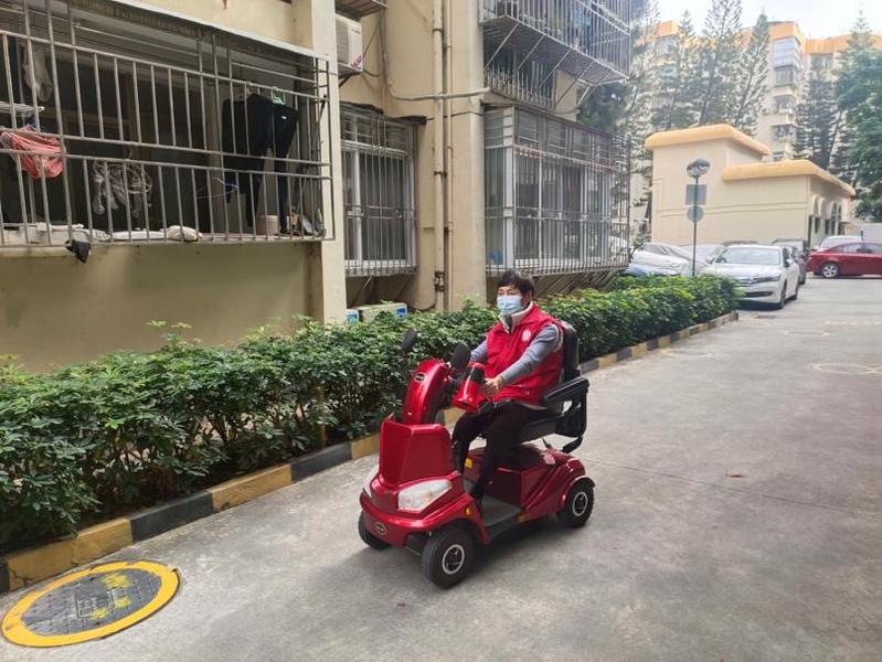 四海社区老年协会党支部党员夏莉莉同志,幼时因患小儿麻痹留下了较严重的后遗症,腿脚不便,平日需要依靠电动代步车行动,其家中还有因脑出血智力衰退、生活不能自理的丈夫,但当本轮疫情来临时,看到核酸检测点工作人员忙碌的身影,夏莉莉同志义无反顾主动报名参加核酸检测志愿者工作。