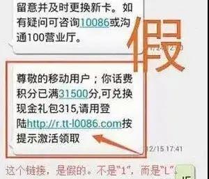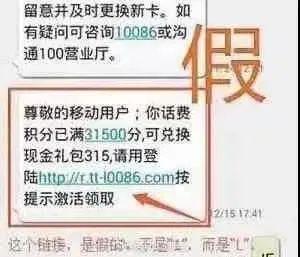 另据广东公安消息,最近,江门市民杨先生收到一条由某电信运营商发来的积分兑换短信,内容是这样的:“尊敬的客户:您好!您的话费积分3160即将过期,请手机登录eb-10086.com/bank激活领取现金礼包。”
