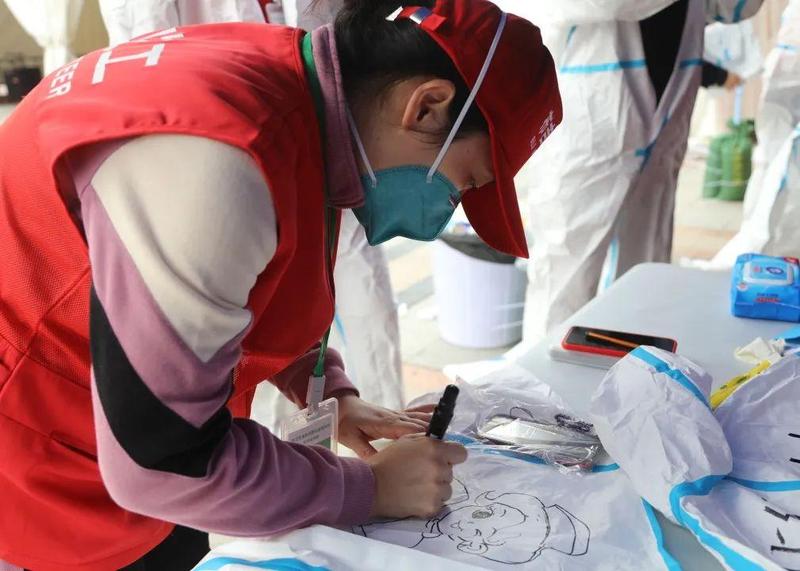 防护服的图案,主要以老虎为主,寓意虎年吉祥,虎虎生威。另外一个图案是麒麟,原型是来自布吉街道核酸检测定制贴纸。周围的医护人员看到后的图案后觉得很有创意,纷纷要求为自己防护服也画上喜爱的图案。社区居民在看到防护服上有趣的图案后,也纷纷跑过来拍照和录视频。近两天,居民也为站点的医护人员送暖宝宝、送贺卡,感谢医护人员和工作人员的辛苦付出。